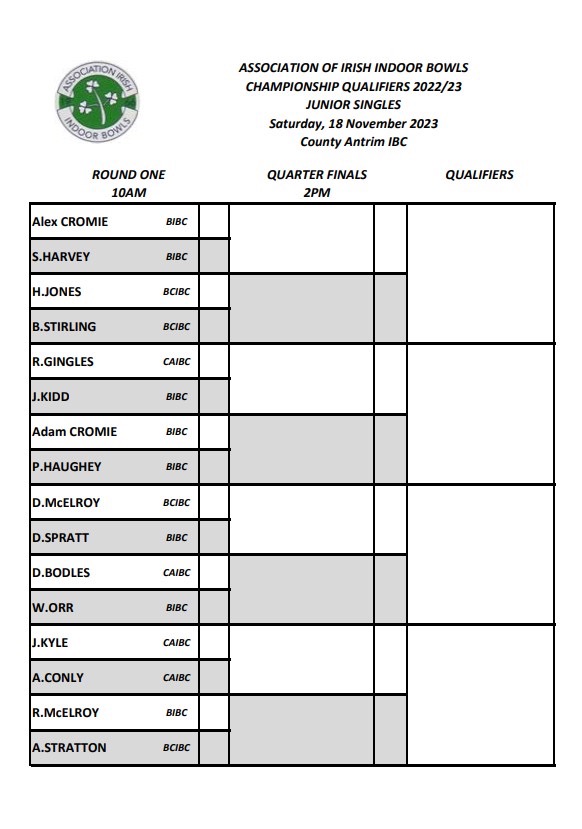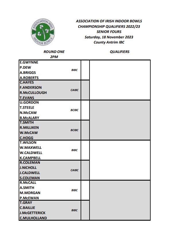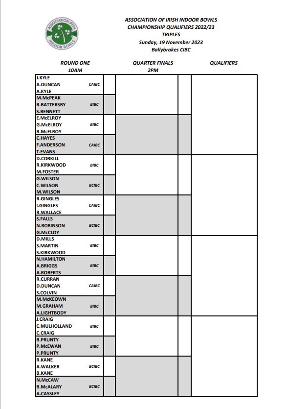 The 2023-24 Season AIIB play-offs start this weekend with the Junior Singles and Senior Fours in County Antrim IBC on Saturday 18th November and the Triples in Ballybrakes Community Indoor Bowls Club on Sunday 19th November. The details are below.