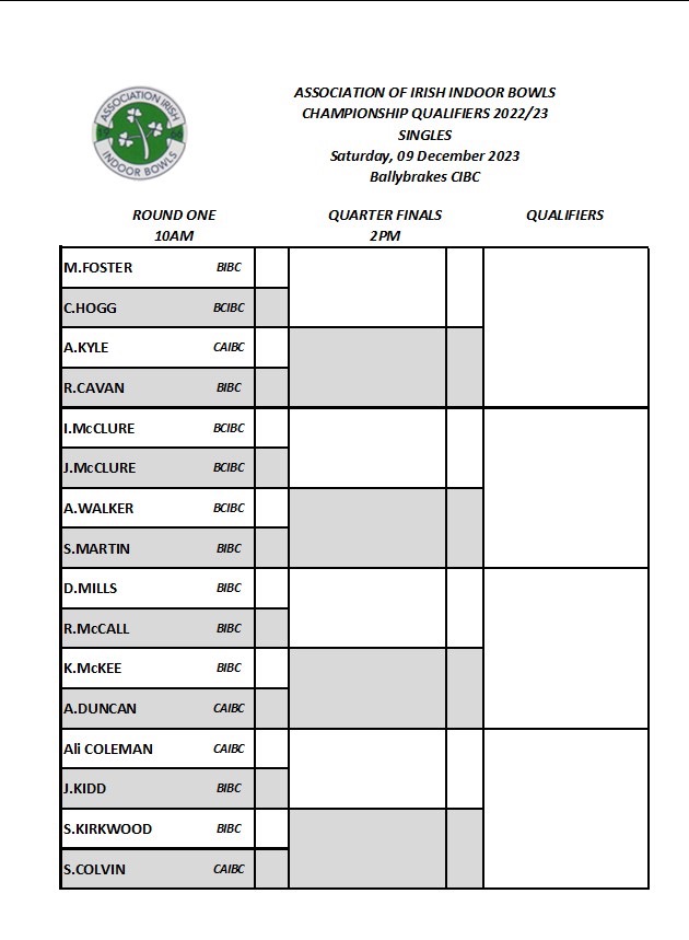 This weekend sees the final two last 16 qualifiers for the AIIB Championships. The Singles will take place on Saturday 9th December at Ballybrakes Community IBC and the pairs on Sunday 10th December in County Antrim IBC. The Semi-Finals and Finals are on the following weekend in Belfast IBC. The details of this weeks games are below.